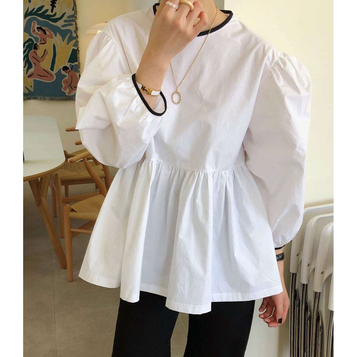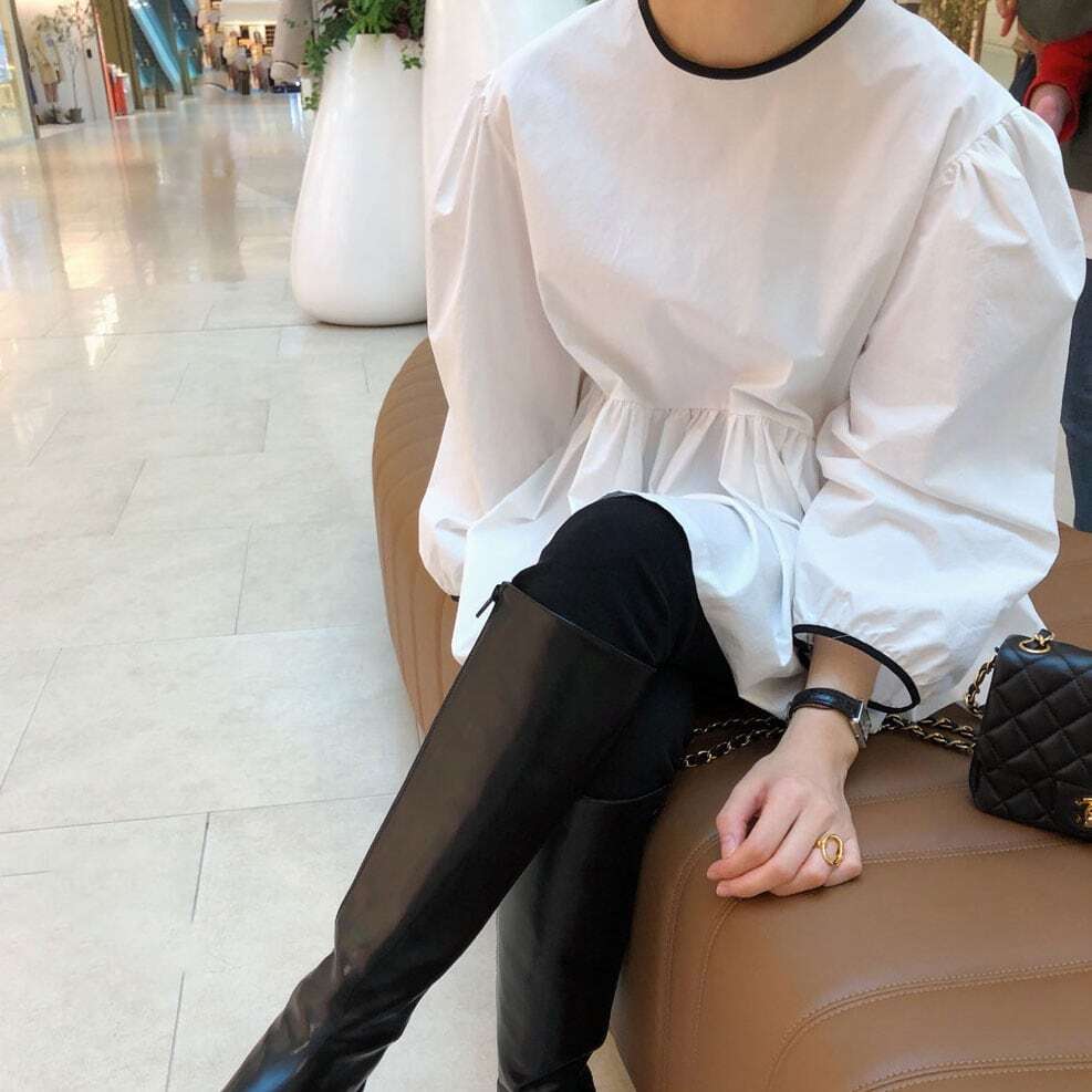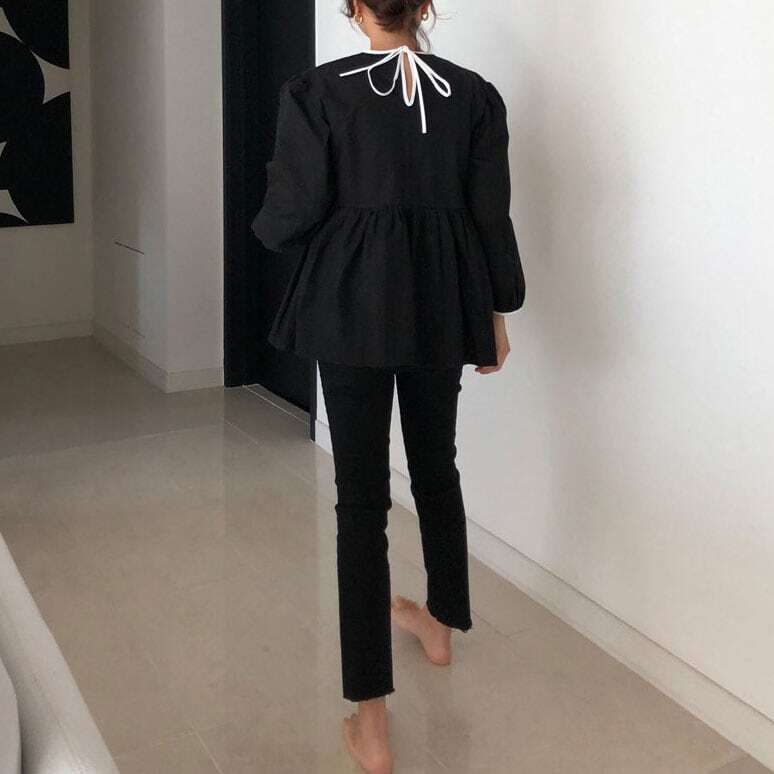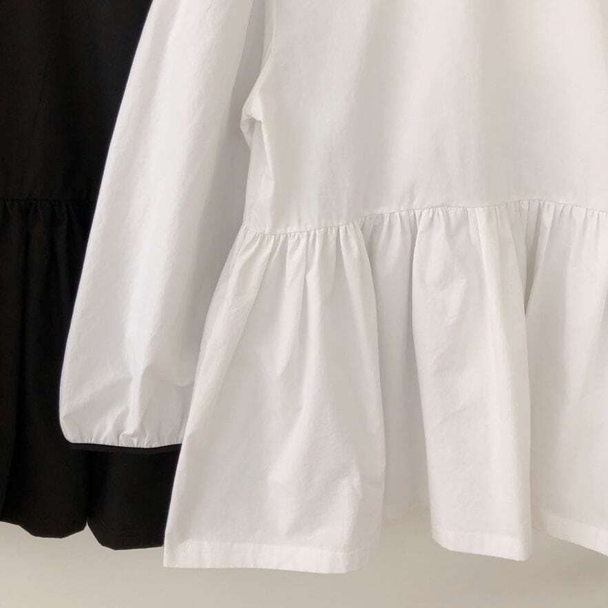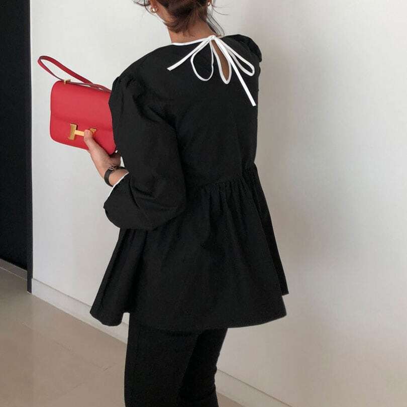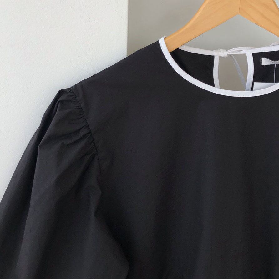 モノトーンカラーのリボンがポイントのブラウス。